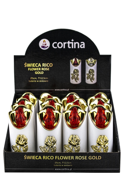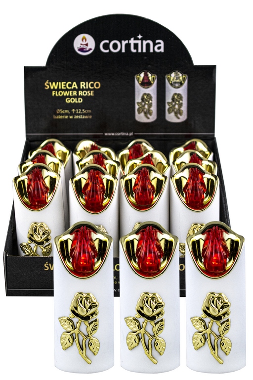 Art. nr: ŚWIECA LED RICO FLOWER ROSE GOLD WHITE Wysokość: 12,5 cm Średnica: 5 cm W opakowaniu: DISPLAY 12 szt. W kartonie: 72 szt. Rodzaj opakowania: kartonowe Zasilane bateriami 2x R6 (baterie w zestawie)