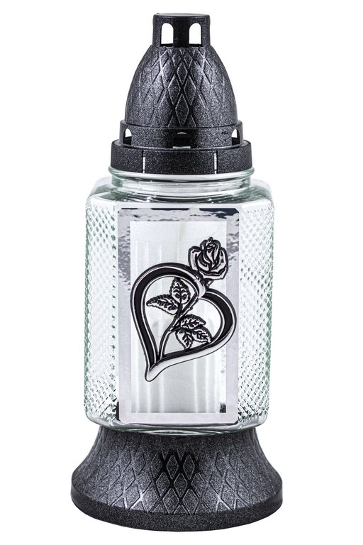 Art. nr: ZW-291 RÓŻA RAMKA SREBRNY Wysokość znicza: 25,5 cmW opakowaniu: 8 szt. Na warstwie: 64 szt. Rodzaj opakowania: foliowe