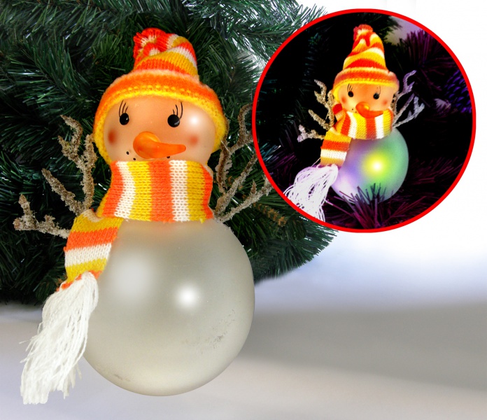Art. nr: DB0012. Bałwanek średni z podświetleniem LED RGB zmieniający kolor. W kartonie - 36 szt. Rozmiar - 15 cm x 12 cm. Zasilanie - 3 x baterie LR41 ( baterie w zestawie).