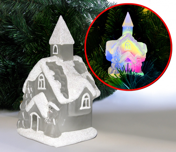 Art. nr: DB0011. Szklany domek z podświetleniem LED RGB (zmieniający kolor) - duży. W kartonie - 30 szt. Rozmiar - 12,5 cm x 17 cm. Zasilanie - 3 x baterie LR41 ( baterie w zestawie).