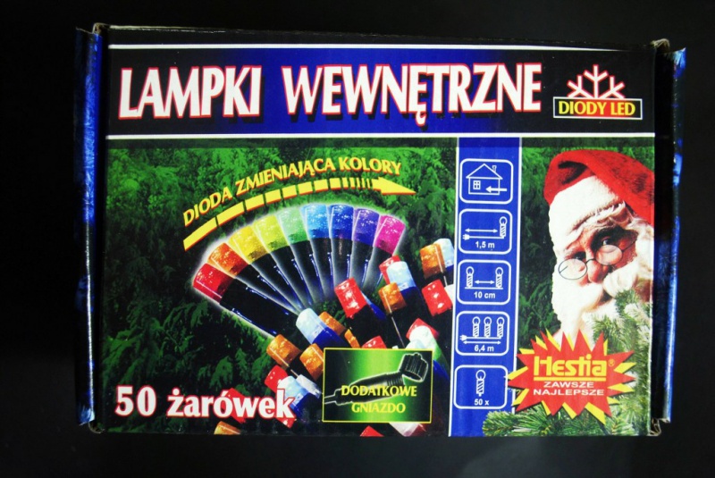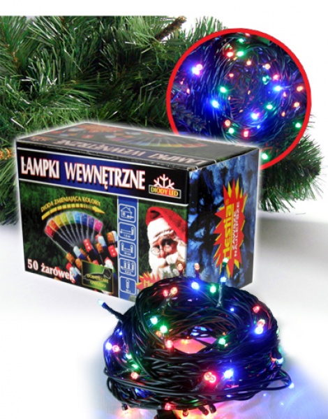 Art. nr: D50G-CC Diody LED wewnętrzne zmieniające kolor 50 pkt. świetlnych z dodatkowym gniazdem W kartonie: 12 szt. / Waga: 4,8 kg brutto Długość strojenia: 5 m / dioda co 10 cm Występuje w kolorach: multi - zmieniające kolory