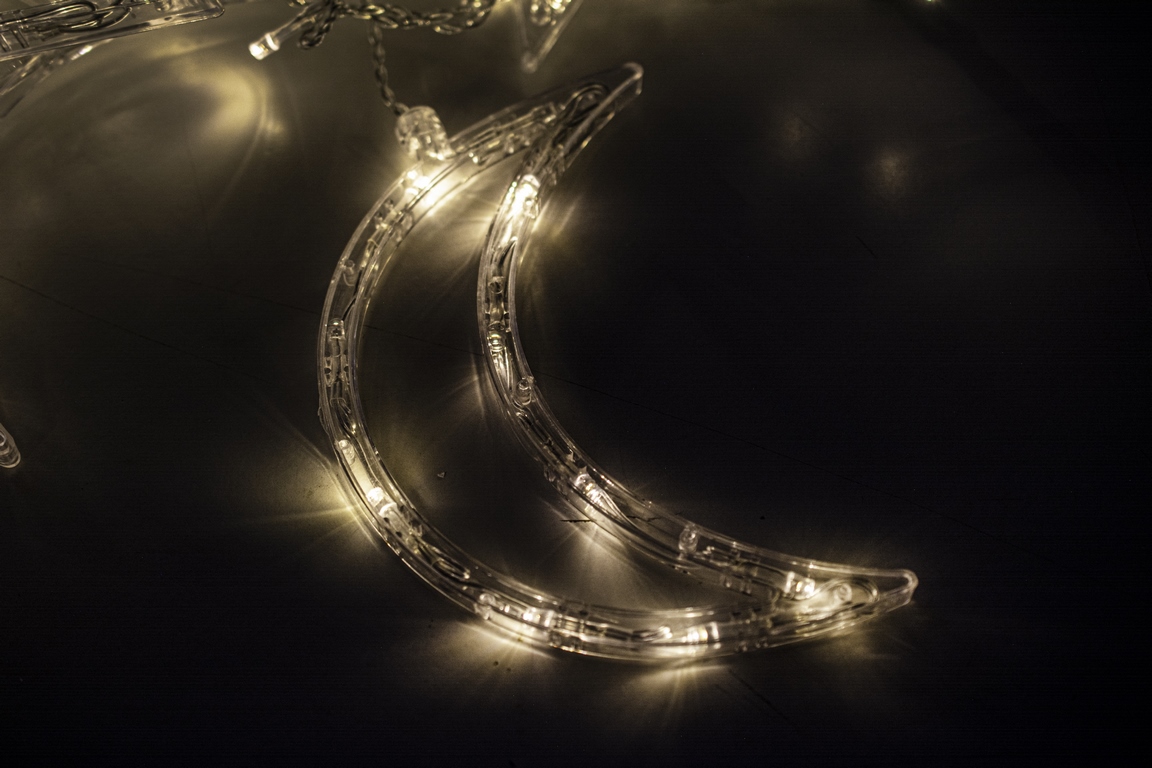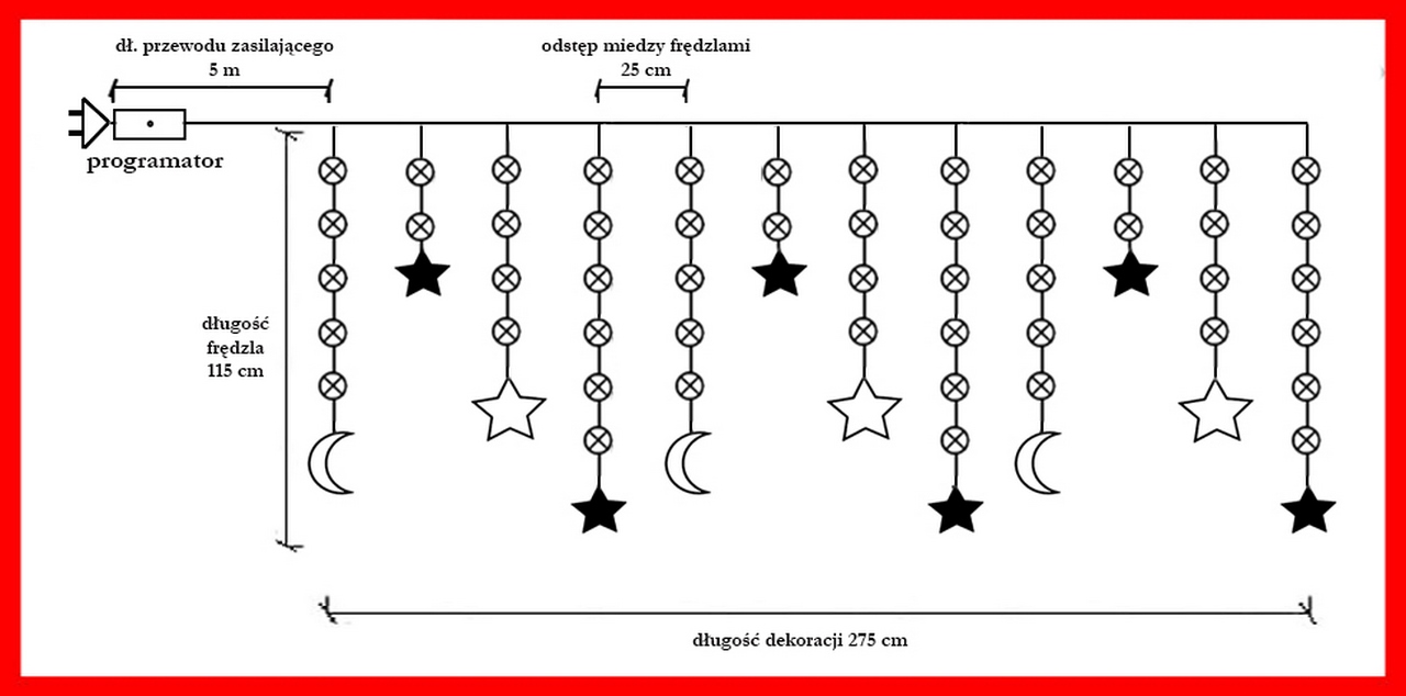 Dekoracyjna kurtyna zewnętrzna FIGURKI LED GWIAZDY i KSIĘŻYCE z programatorem (8 funkcji sterowania), na przezroczystym przewodzie. Kurtyna składa się z 12 frędzli z punktami LED oraz FIGUREK - DUŻA GWIAZDA, MAŁA GWIAZDA oraz KSIĘŻYC umieszczonymi na końcu każdego frędzla.