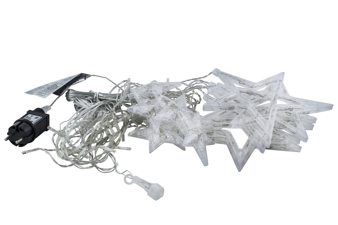 Dekoracyjna kurtyna zewnętrzna GWIAZDKI LED z programatorem (8 funkcji sterowania) z dodatkowym gniazdem (możliwość łączenia), na przezroczystym przewodzie. Kurtyna składa się z frędzli długości 40 cm i 80 cm z punktami LED oraz gwiazdki umieszczonej na końcu każdego frędzla.