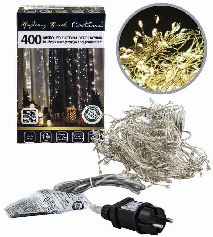 Kurtyna LED 400 pkt. 135x190cm z programatorem, na druciku, zewnętrzna, biały ciepły 77/19/NIK/WW