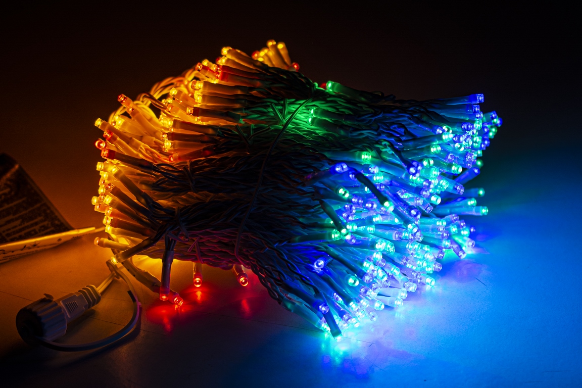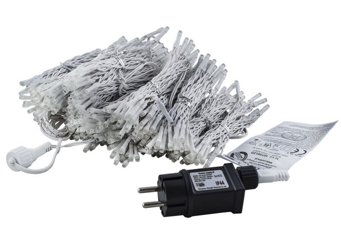 Diody LED Kurtyna z programatorem (8 funkcji sterowania). Lampki posiadają dodatkowe gniazdo (możliwość łączenia kompletów). Biały przewód zasilający.