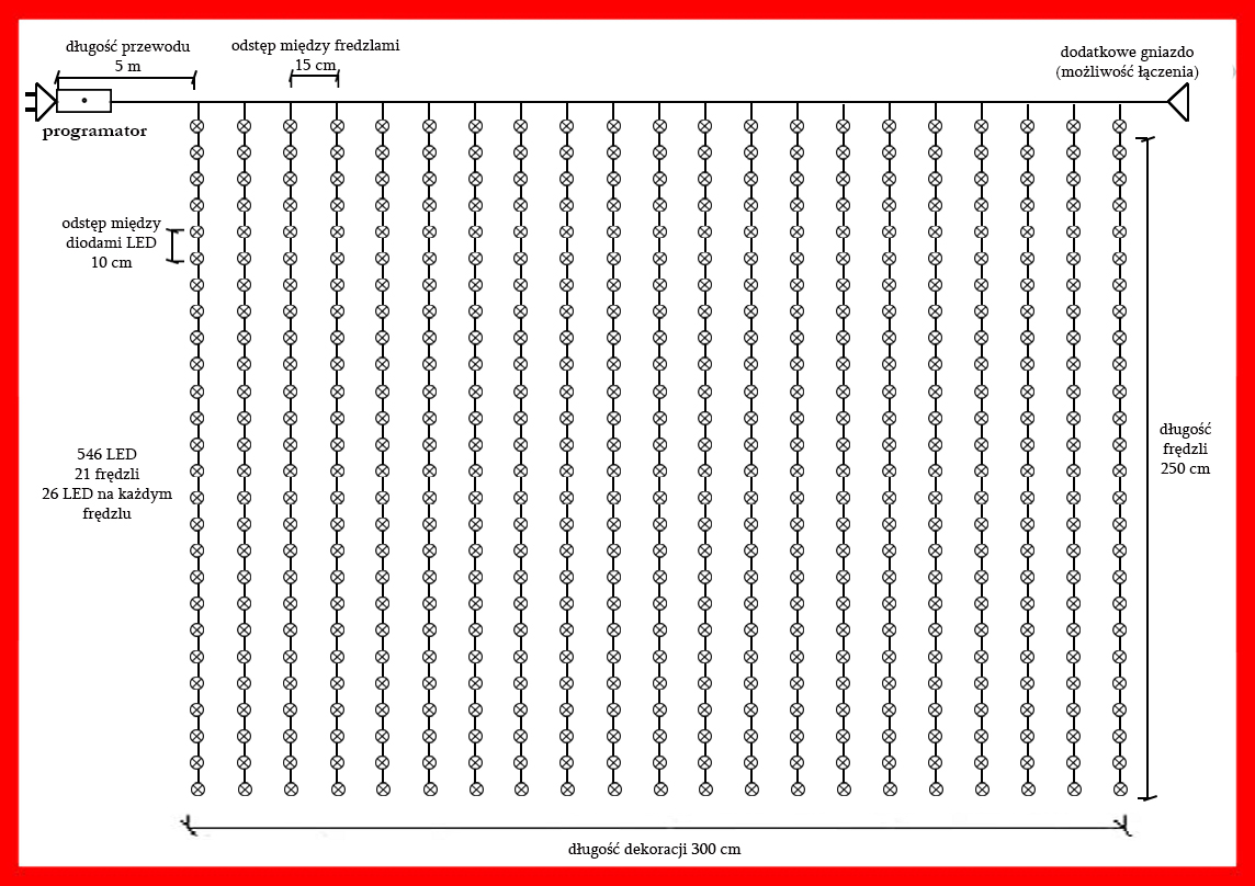 Odstęp między frędzlami (soplami): 15 cm (21 frędzli po 26 LED)
