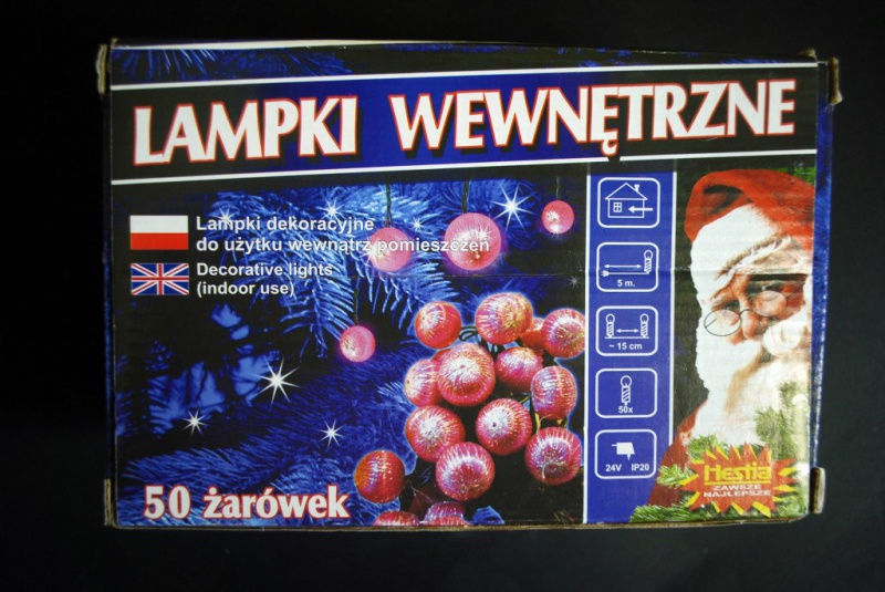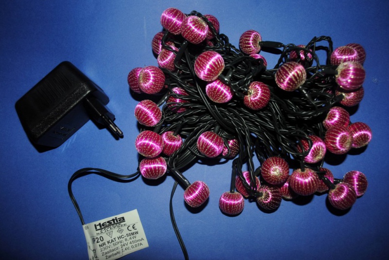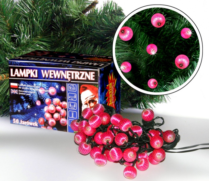 Art. nr: HC-50MW Lampki choinkowe wewnętrzne, 50 pkt. świetlnych, różowa kulka średnicy 2,5 cm opleciona złotą nitką, po włączeniu wpadająca w czerwień, W kartonie: 12 szt. / Waga: Długość strojenia: 7,5 m / kulka co 15 cm Występuje w kolorach: różowa kulka
