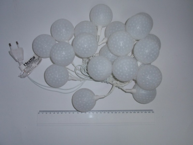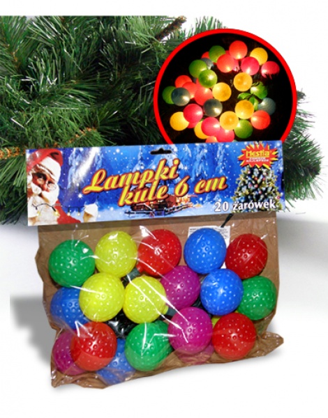 Art. Nr: H20B Lampki choinkowe "plastikowe kule" - 20 żarówek W kartonie: 12 szt. / Waga: 4 kg brutto Długość strojenia: 3 m / żarówka co 15 cm Występuje w kolorach: biały, multi