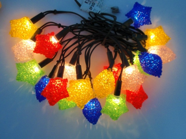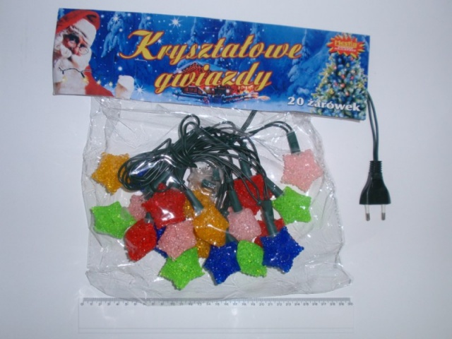 Art. Nr: H20KZ-5 Lampki choinkowe kryształowe gwiazdy małe W kartonie: 20 szt. / Waga: 12 kg. Długość strojenia: 3 m / żarówka co 15 cm Występuje w kolorach: multi Zużycie energii: 22,8W/h