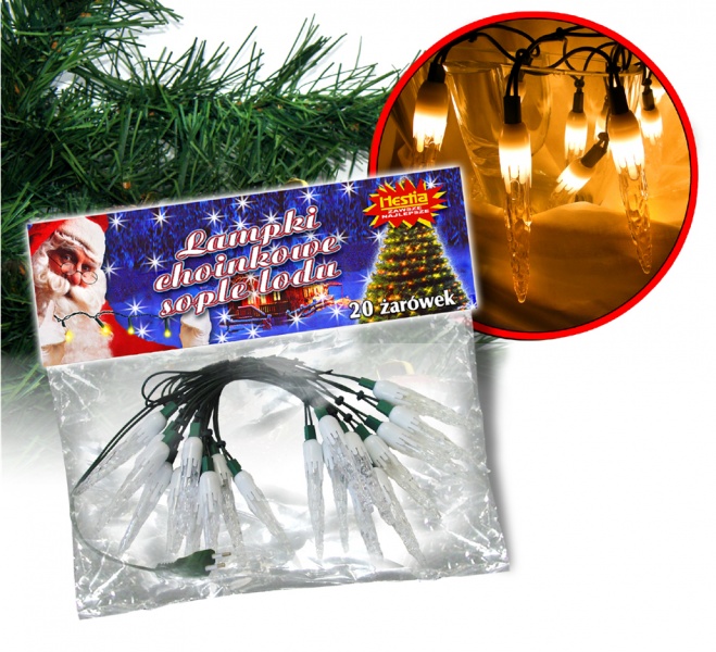 Art. Nr: H20S Lampki choinkowe sople lodu - 20 żarówek W kartonie: 24 szt. / Waga: 6,5 kg brutto Długość strojenia: 3 m / żarówka co 15 cm Występuje w kolorach: biały Zużycie energii: 22,8W/h