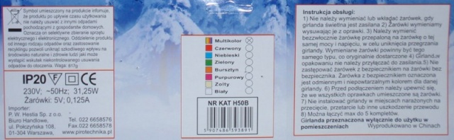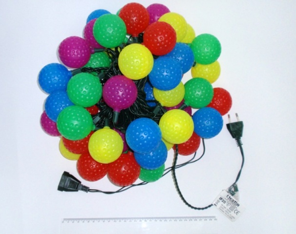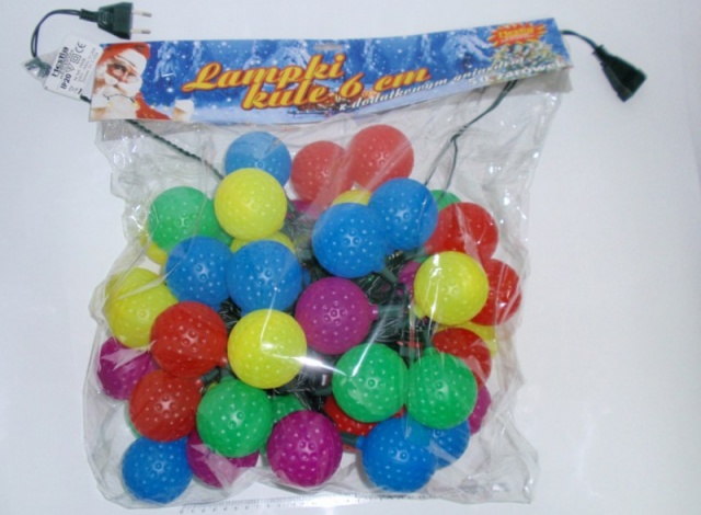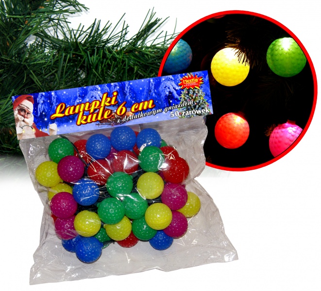 Art. Nr: H50B Lampki choinkowe "plastikowe kule" z dodatkowym gniazdem - 50 żarówek W kartonie: 10 szt. / Waga brutto: 9,2 kg Długość strojenia: 9,5 m / kula co 19 cm Występuje w kolorach: multi Zużycie energii: 31,25W/h