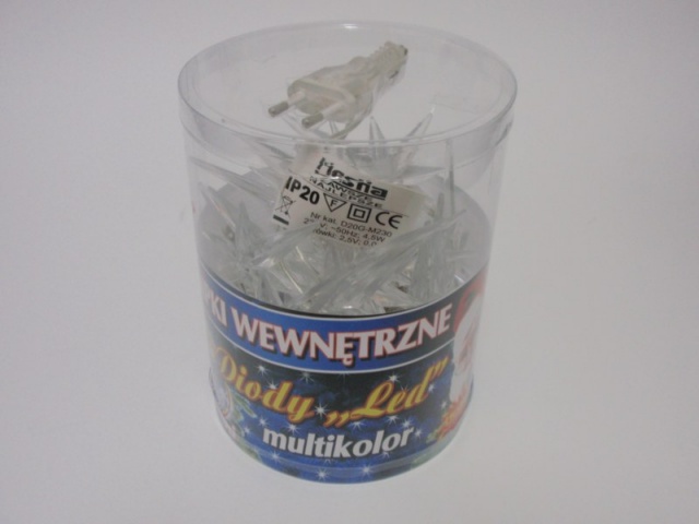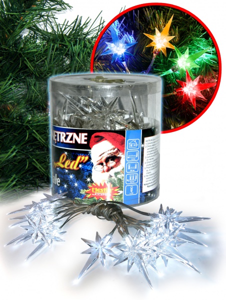 Art. nr: D20G. Lampki dekoracyjne gwiazdki LED - 20 żarówek. W kartonie - 12 szt. / Waga - 6 kg brutto. Długość strojenia - 4 m / gwiazdka co 20 cm. Występuje w kolorach: multi, biały. Zużycie energii - 4,5 W.