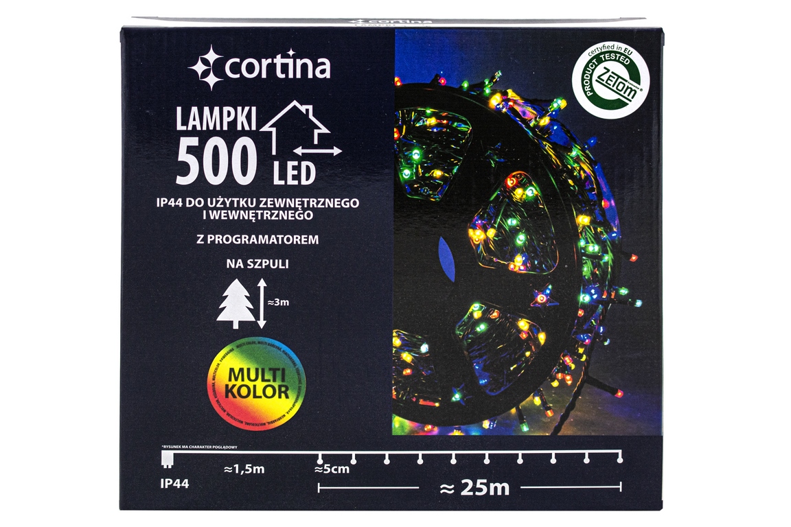 Sznur 25m 500 LED na SZPULI, PROGRAMATOR 8 FUNKCJI + PAMIĘĆ, zewnętrzne, multikolor 620/21/LED/M-SZPULA