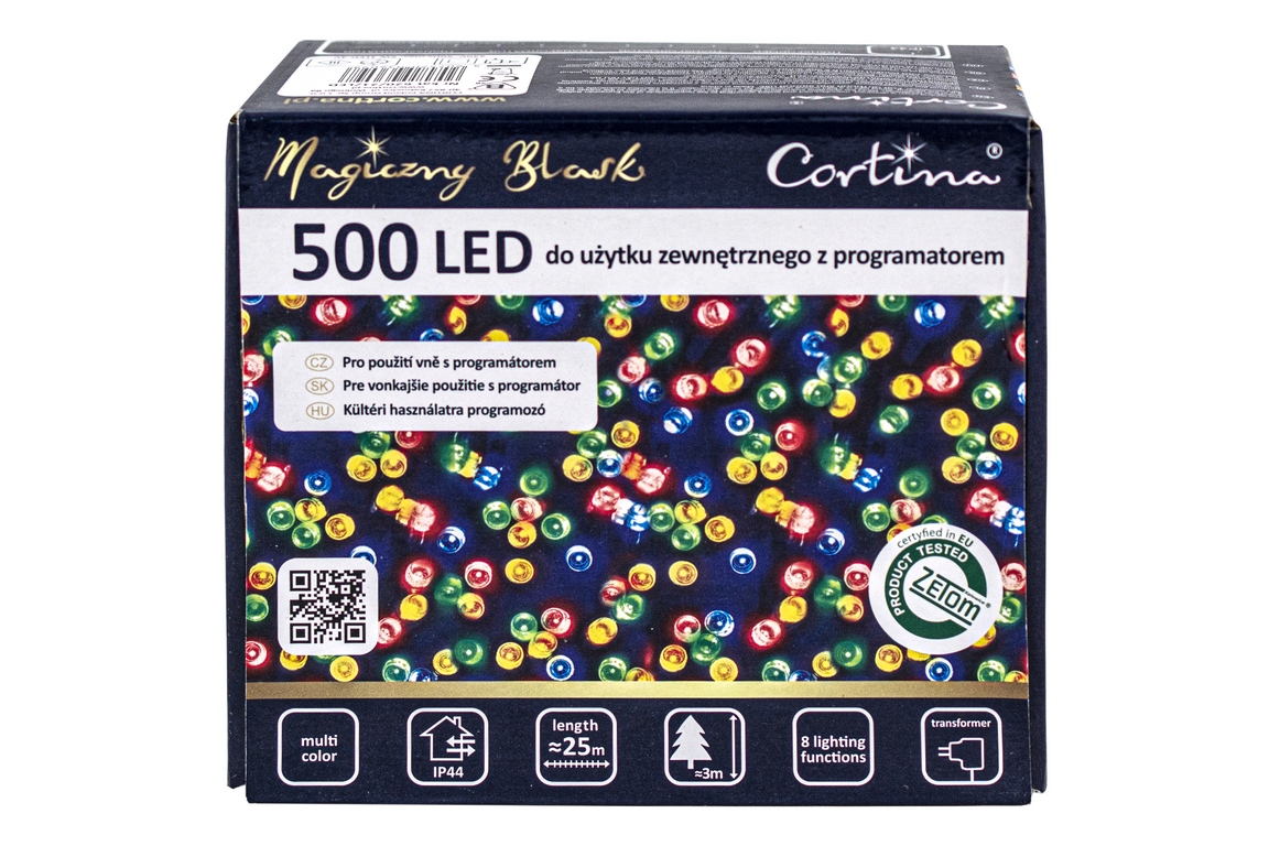 Sznur 25m 500 LED PROGRAMATOR 8 FUNKCJI + PAMIĘĆ, zewnętrzne, multikolor 620/21/LED/M