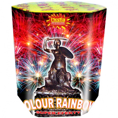 Tort wyrzutnia 19 strzałów - wschodząca z wirem ogonem i gwizdem kometa eksplodująca kolorawą piwonią z długim opadem
